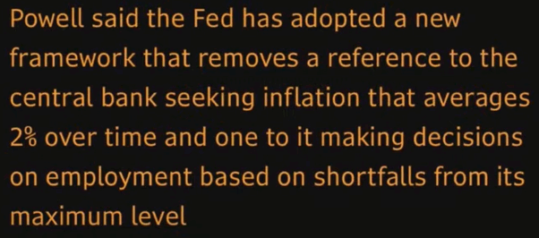 Powell’s major policy announcement was that the FED would no longer target 2% inflation. Many pundits believe that the new target will be somewhere around 3% (which is where we are now) or possibly even 4%. Additionally, Powell said that from here on out, the FED will be targeting maximum employment rather than inflation (which could kick inflation up from current levels).